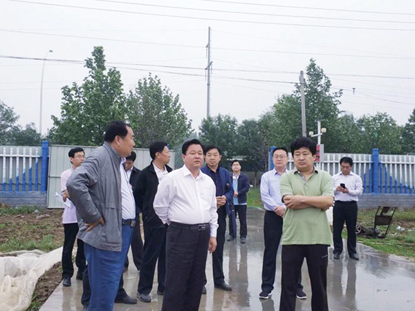 2018年7月19日,縣長王成宗(中)、開發(fā)區(qū)主任候會然(右一)在新公司施工現(xiàn)場視察工作